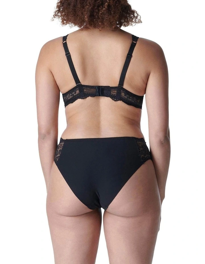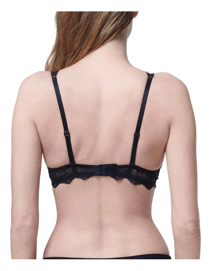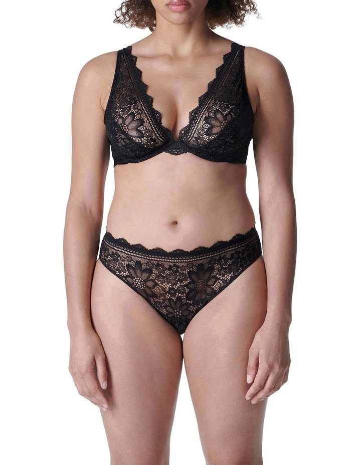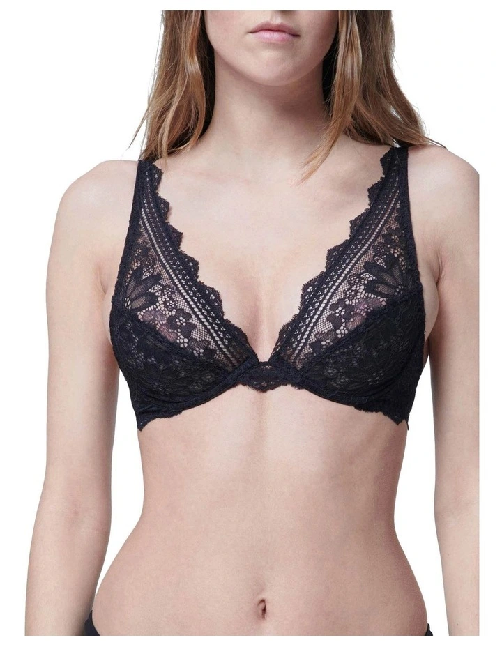 The Freesia Underwired Triangle Bra by Simone Perele lifts while separating cleavage and providing full chest coverage. Its constructed with a plunging neckline and adorned with vintage-style lace detail, while geometric pieces embellish the two-column fastening.
