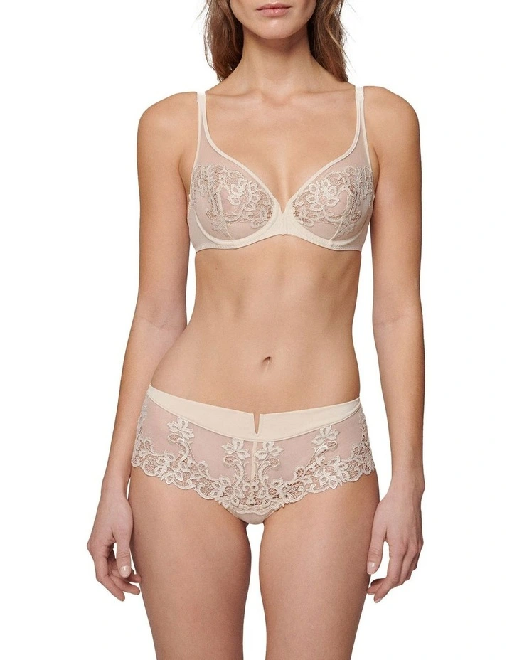 The Saga Full Cup Plunge Bra by Simone Perele is an elegant piece that features a double play of ornamental guipure lace and clean modern lines. Made with highest level of craftsmanship, the fluid supportive shape is supported by a flat band which highlights the deep-V plunge.