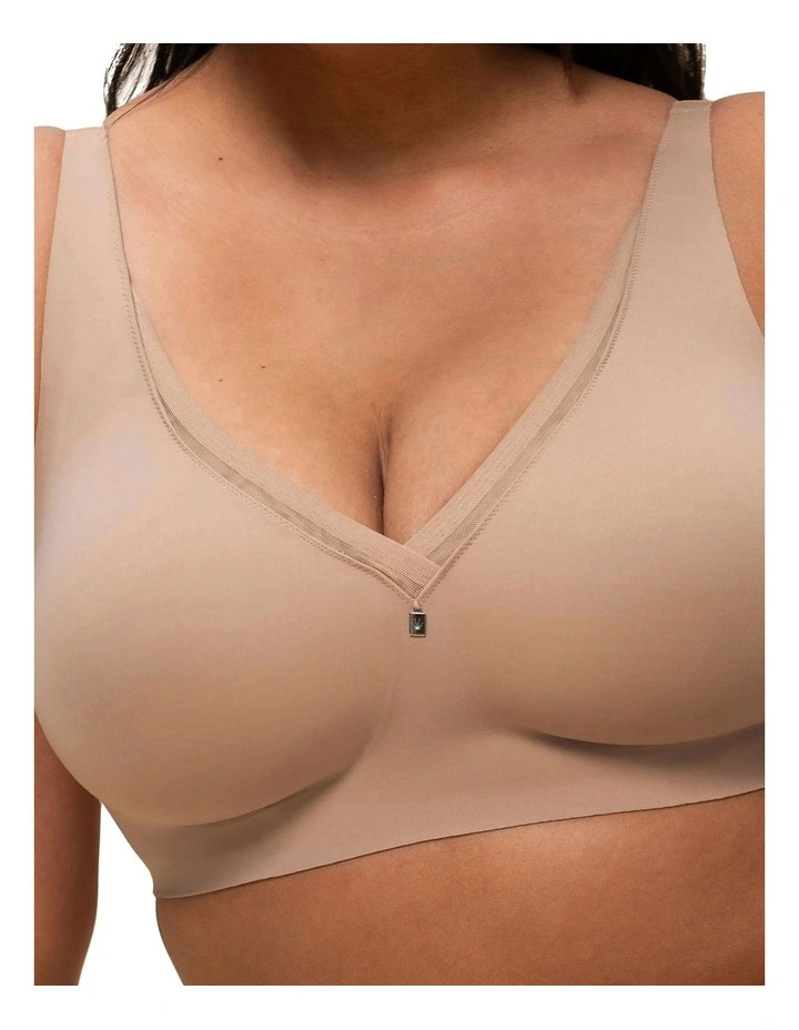 - The model is wearing the wireless bra in size 34 D